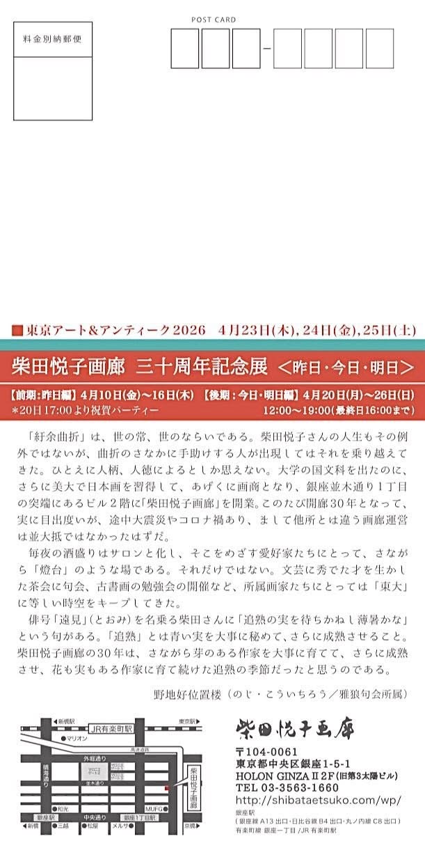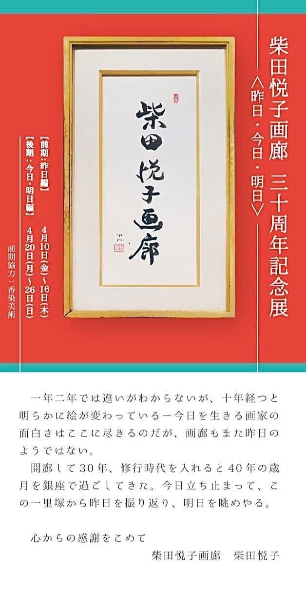 2026年4月26日 / 最終更新日時 : 2026年4月26日 officeiiida Exhibition 展覧会情報2026│柴田悦子画廊 三十周年記念展〈昨日・今日・明日〉 前期:昨日編 4月10日(金)〜16日(木) 後期:今日:明日編 4月20日(月)〜26日(日) 開場時間:12:00 -19:00/最終日17時まで会場:柴田悦子画廊〒104-0061 東京都中央区銀座1−5−1 HOLON GINZAⅡ2F(旧第3太陽ビル) Tel:03-3563-1660 \ 最新情報をチェック /